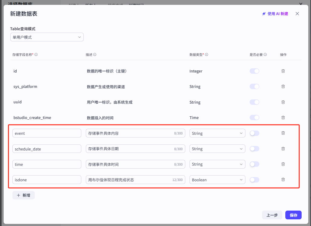 然后添加相关字段,这个部分其实和前面的流程是差不多的,大家跟着我们一步步做体验一下数据库相关功能是怎样的就行