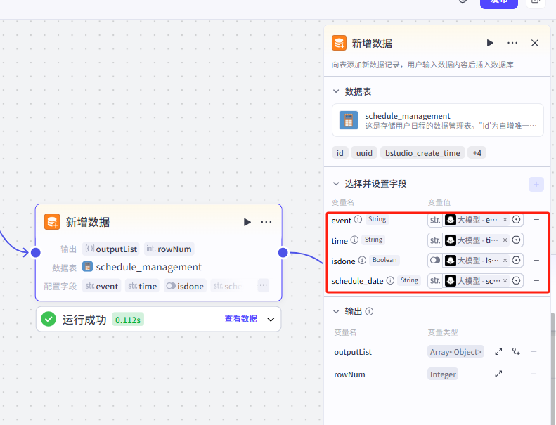 比如我们先设置一个新增数据的工作流,在前面再增加一个大模型节点
