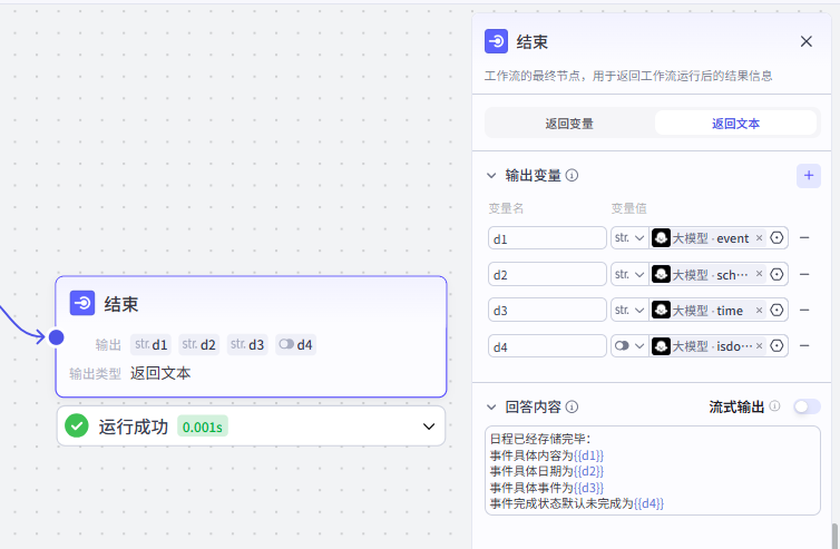 在结束节点添加四个变量,输出一下,展示我们的存入内容