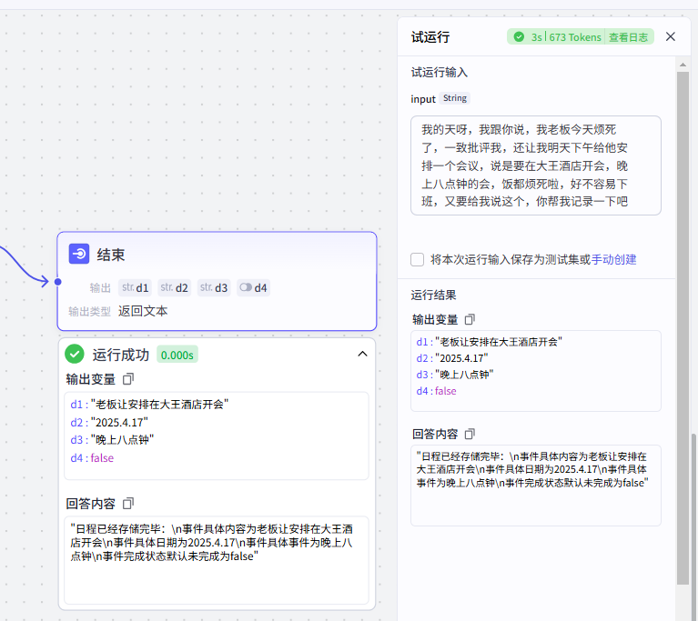 这里重点说一下,如果是一个长文本中包含了四五个日程安排的情况,需要用到工作流中 循环 的处理方式,这个比较复杂,在后面会给大家引入该如何处理