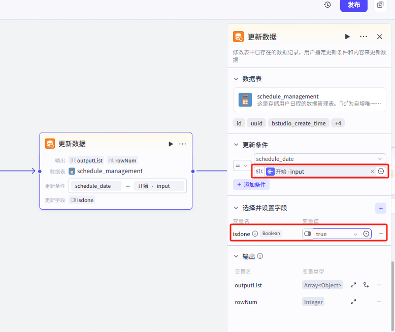 中间的更新条件部分的设置和它的设置逻辑也一样,我们可以输入或者引入一个参数