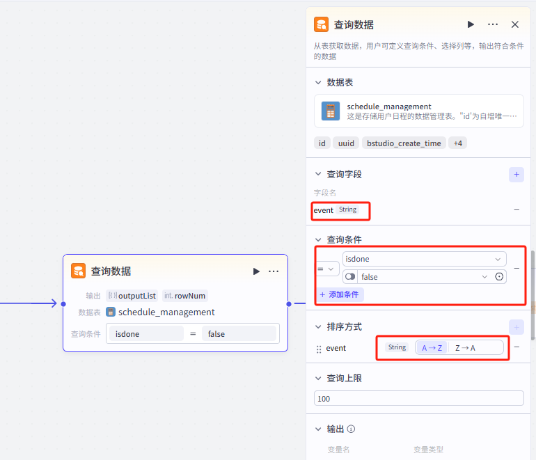 那么整个流程就是,查询日程的 'isdone' 是否为否,为否就输出查询字段 'event' 日程内容