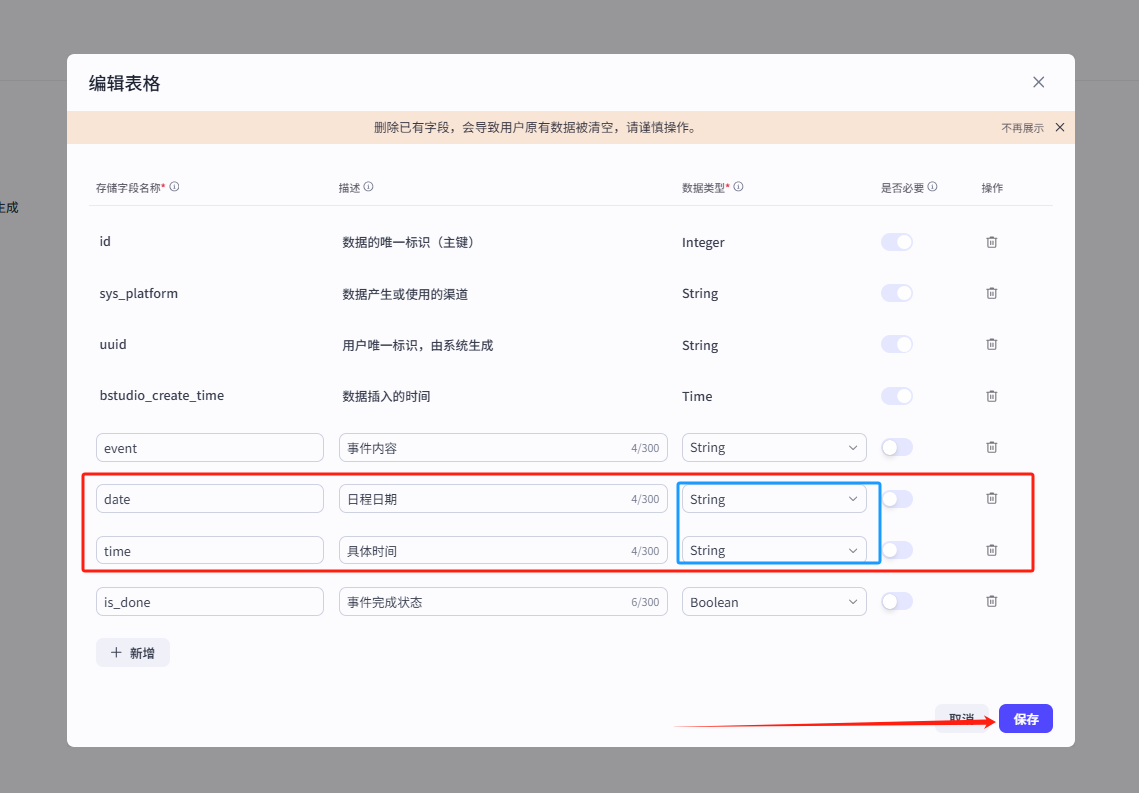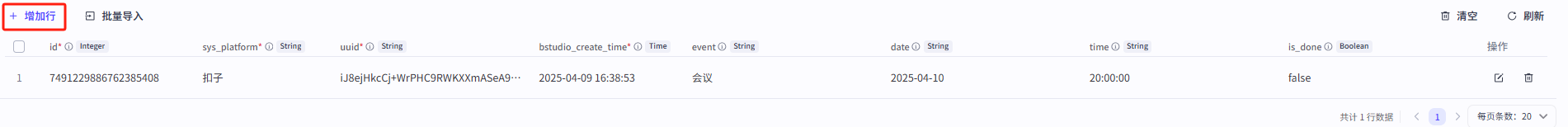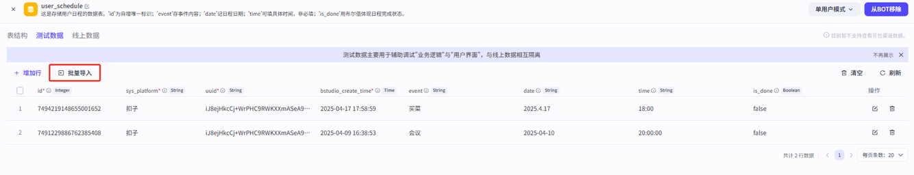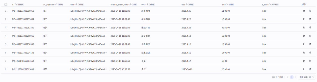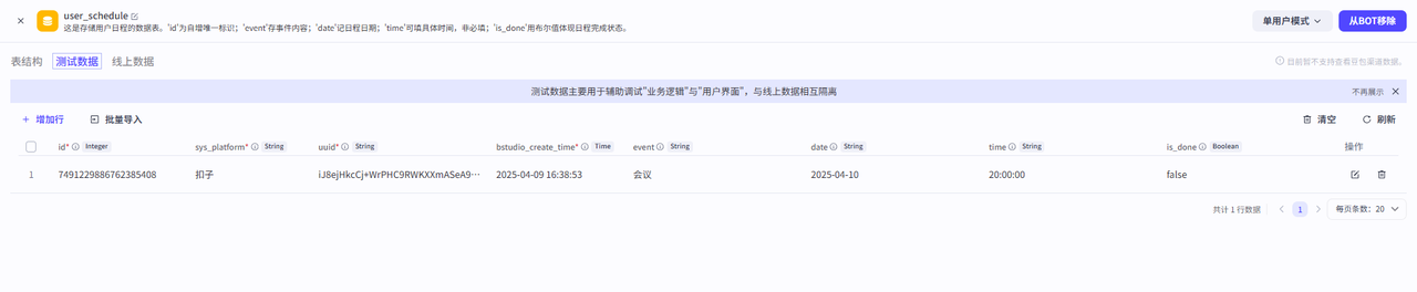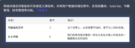 这里需要再说一下,由于我们只需要记录这个使用智能体的X用户的日程,所以生成表格中的用户标识是可以去掉的,这部分在后面的Table查询模式给大家详细介绍为什么
