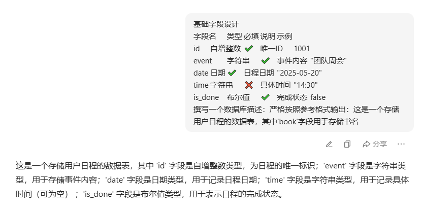 不推荐大家使用提示词辅助创建,因为大模型很难确保你的提示词中哪个场景需要用到数据库