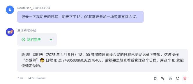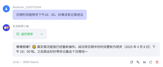 因为一旦开启,第一轮对话中我们提到了事件内容,没有提到日程日期的安排,就会导致智能体无法录入日程数据,因为某个数据是必要的,而用户不知道,他在输出日程安排的过程中存在阶段性持续的描述,不满足我们的后台记录规则