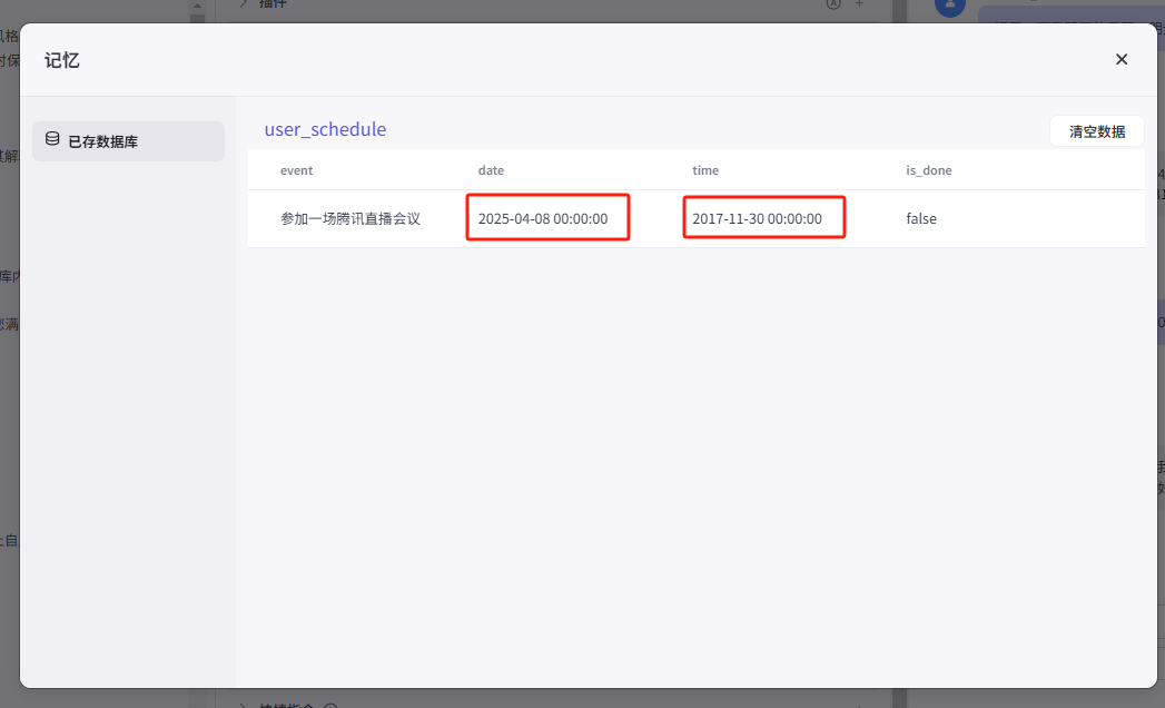 检查发现,这个日期格式和具体的数据都不对,我们尝试再次让智能体记录一下,看是不是没有调用成功