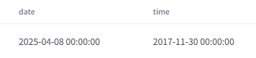 我们在最开始设计数据库表格数据的时候,按照DeepSeek输出的表格格式,设置了这两个时间字段为Time格式,我们以为Time格式是日期或者时间这样分开的数据,但是在数据库表格中的记录情况是一个完整的Time