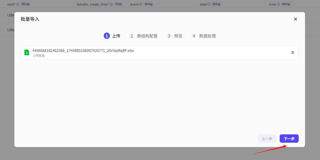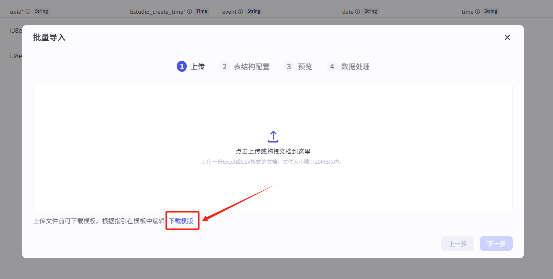 点击之后会出现这个弹窗,需要我们上传文件,不过自己制作的表格文件不太符合平台的标准,我们需要下载平台的文件模板