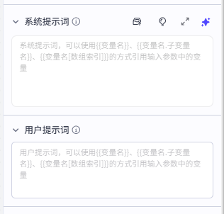 然后就是这个提示词部分,通常提示词都是写在系统提示词部分,用户提示词处大家可以应用一下用户的输入变量,方便大模型在处理特殊逻辑的提示词的时候能够更好的理解我们需要引入的变量是什么