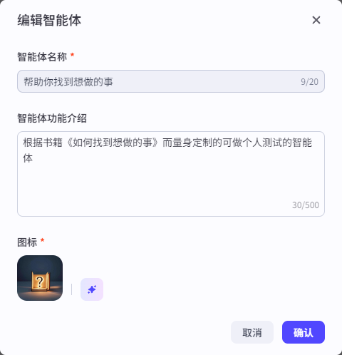 先创建一个智能体,就叫“帮助你找到想做的事”,如果用别的书籍,就可以叫“帮你找到你的优势”