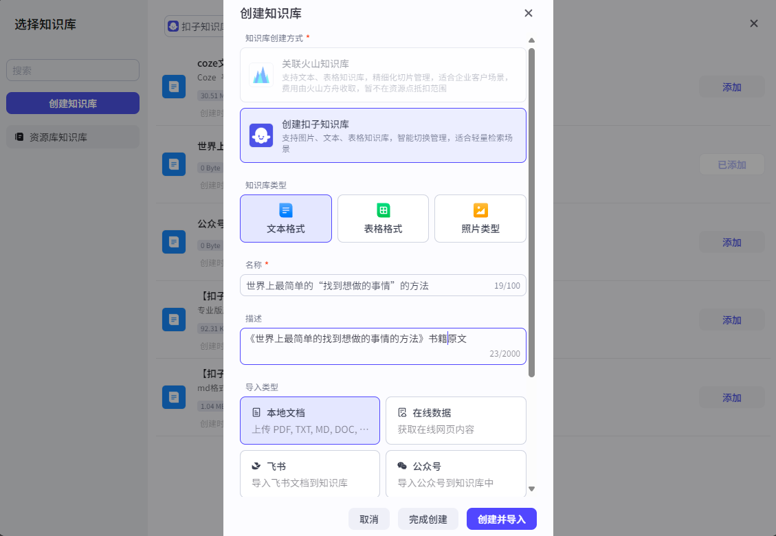 点击“创建知识库”,把书籍的原文上传到文本格式的知识库中