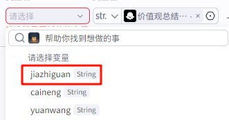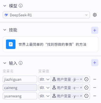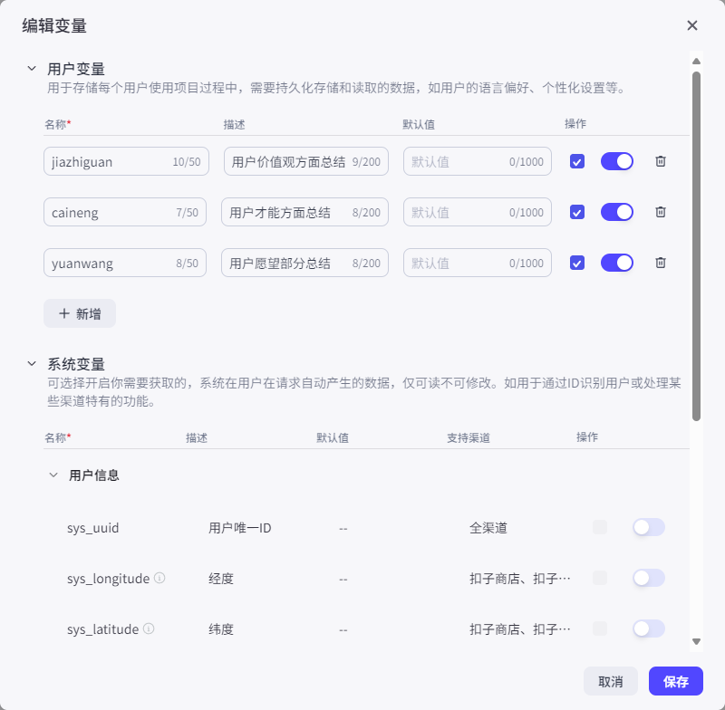 之后在智能体的“记忆”板块,给智能体添加几个变量,因为测试,需要保留一些用户的测试结果,以供后面分析使用,所以需要预先配置一些用户变量,识别一个人想做的事,是通过【价值观×才能×愿望】这几个测试,那么就创建三个变量,分别为“jiazhiguan”、“caineng”、“yuanwang”