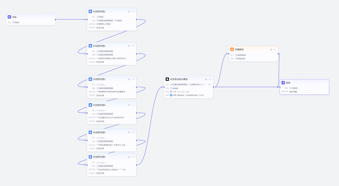会逐一向用户提问,用户作答后会继续提问下一个问题,最后大模型根据用户的回答,参照原书的内容,给出用户价值观部分的总结,并且对用户变量“jiazhiguan”赋值,以便后续给出用户精准建议引用