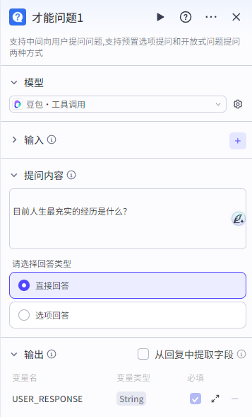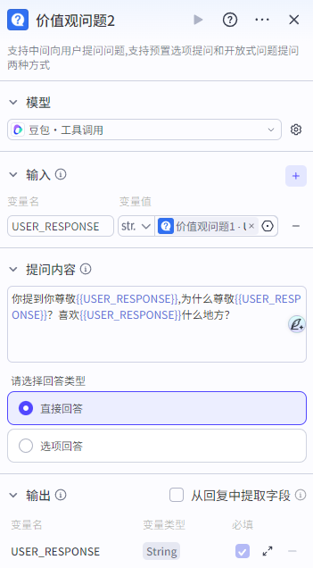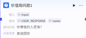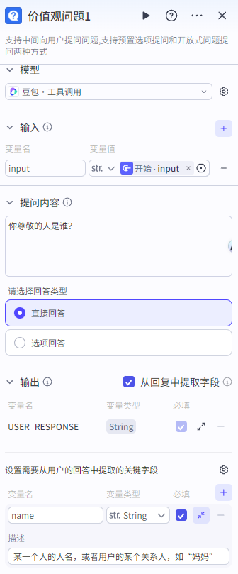 根据书中内容,依次输入需要用户作答的问题,第一个问题即是“你尊敬的人是谁”,因为问题是开放式的,没有预设选项,所以回答类型选择“直接回答”,大模型选择最基础快速的即可