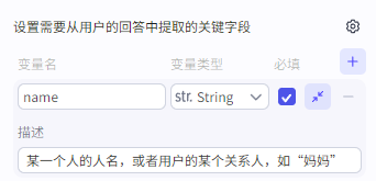 如果需要从用户的回答中提取关键信息,则可以设置变量,如这里面可以设置一个“name”变量,需要用户回答具体的人或者关系,如果回答内容不符,大模型会判断并且根据描述自动追问