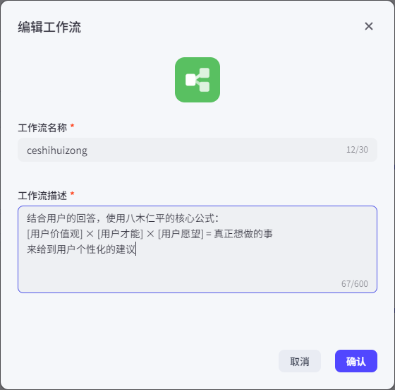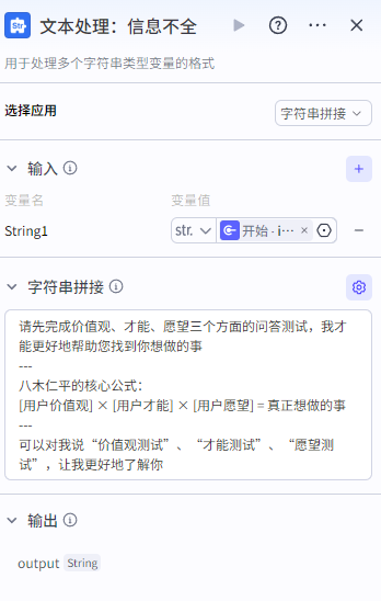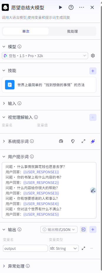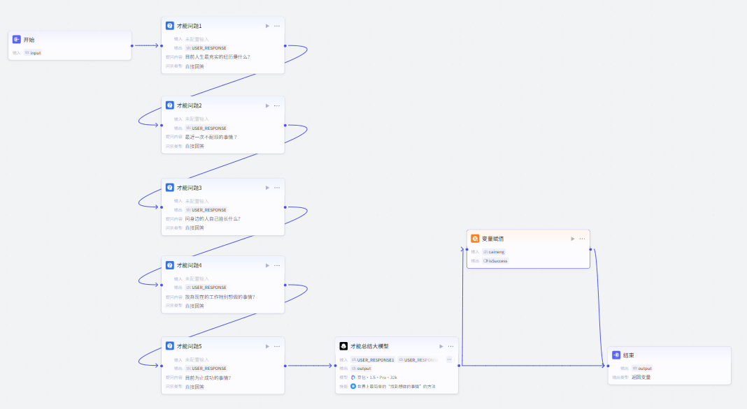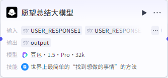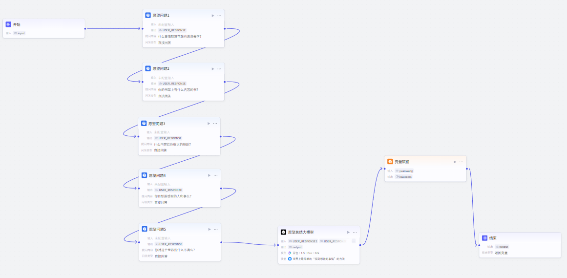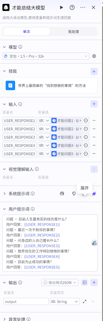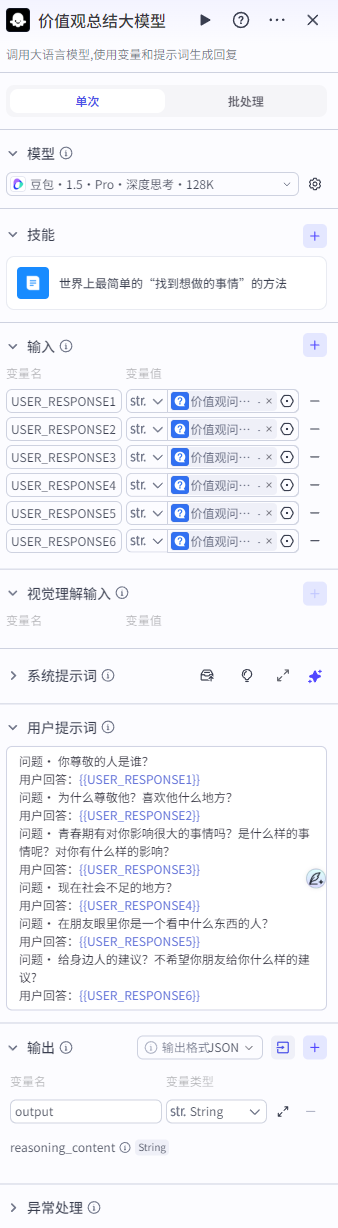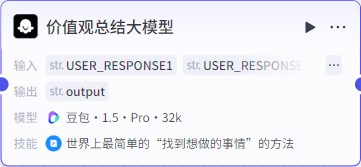 在用户做完三项测试之后,就可以根据用户的回答,通过大模型的分析,给用户一个关于《找到想做的事》的个性化推荐,那么现在就搭建一个汇总用户回答的总结内容并进行分析的工作流