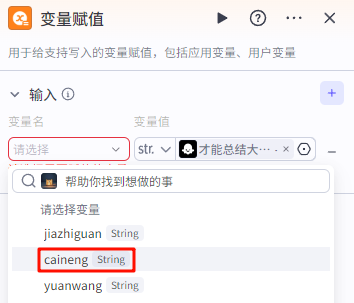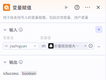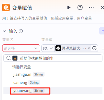 这个节点的作用就是将输入的变量绑定前面我们在创建智能体的时候预设的用户变量