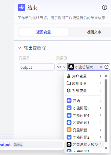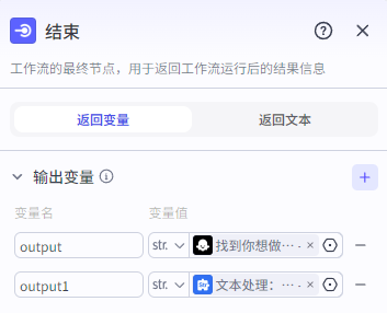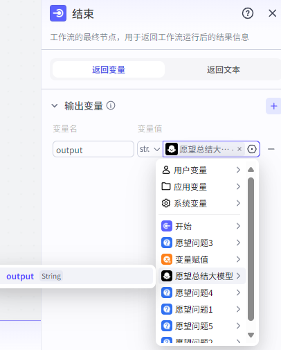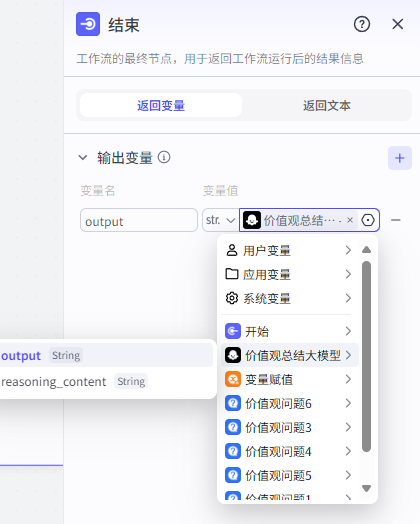 将大模型的输出内容和用户信息不全的文本提示都连接并输入到结束节点