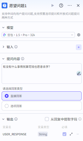 所以我就想到用coze的问答节点功能,来动态化地引导用户在对话中了解自己的情况,同时借助大模型的能力,解决书中难以将理论转化为“千人千面”的痛点。