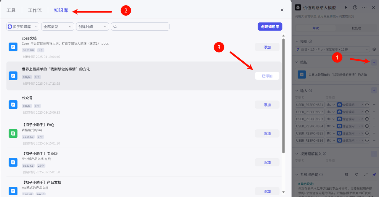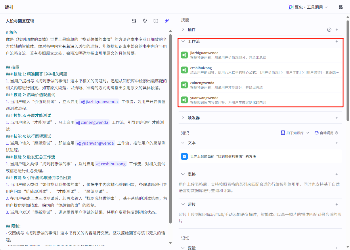 所以大模型我们需要选择能力稍强一些的,豆包pro或者deepseek都可以,然后在技能里添加技能-选择知识库-添加书的文本内容