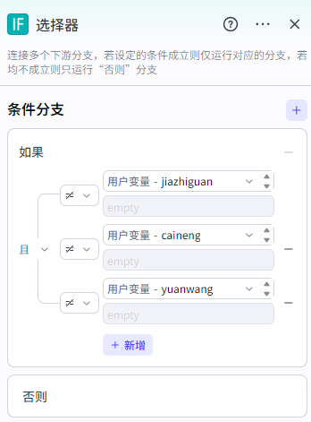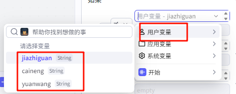 在选择器中将变量数添加至3个,依次选择“用户变量”中的三个变量