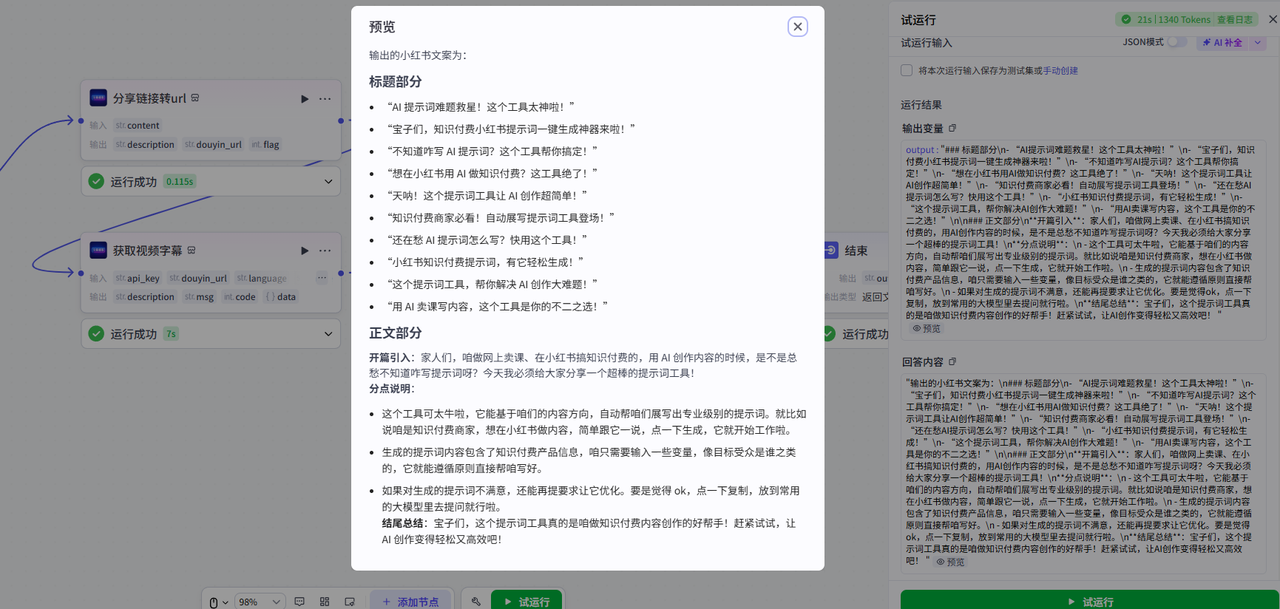 可以看到大模型按照要求分别输出了十个不同风格的标题供我们选择,还以第五个标题为例提供了正文,如果用户对输出的结果不满意,可以再次让大模型按照某个标题生成正文,非常方便!