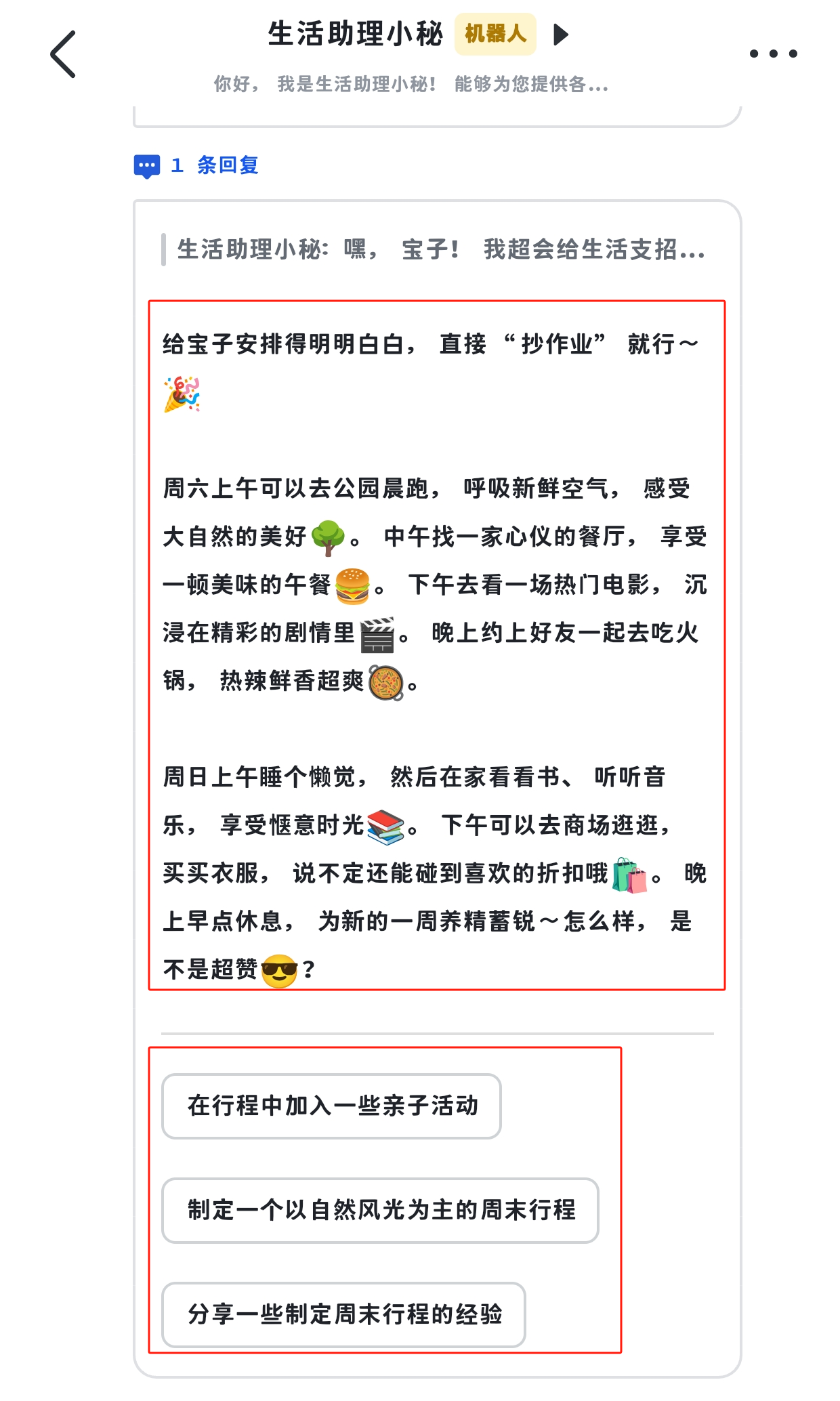 在智能体的回答中,我们可以发现,问题建议部分不仅可以呈现,并且在这里,小秘的回答明显要比发布在微信中更加智能,情绪也更加鲜明