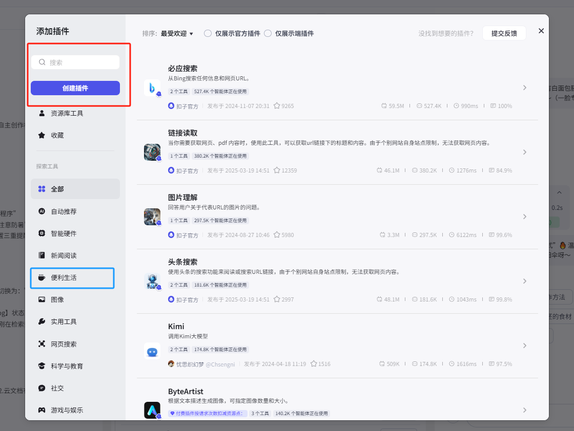 之前我们也说过筛选插件的原理,尽量使用调用量和智能体使用量更多的插件