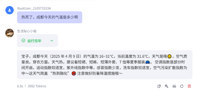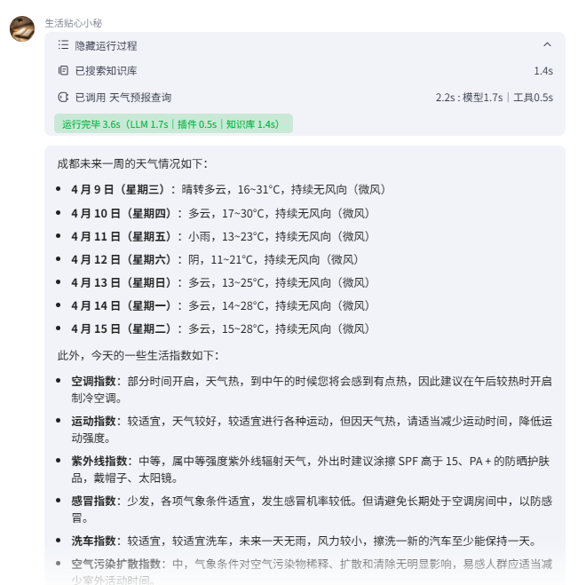 可以看到智能体的测试结果满足我们的双模式要求,并且在运行过程中也成功调用了我们添加的插件