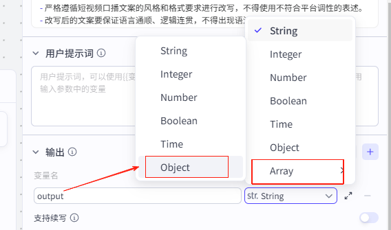所以大模型的输出是我们根据预期的表头所需的每一个数据,我们使用数组来存储每一行的内容,所以这里选择输出变量的类型为Array-Objet