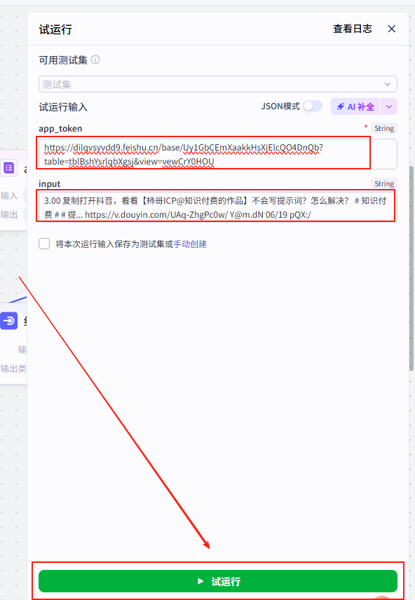 输入飞书多维表格链接和抖音的分享链接,然后再次点击试运行