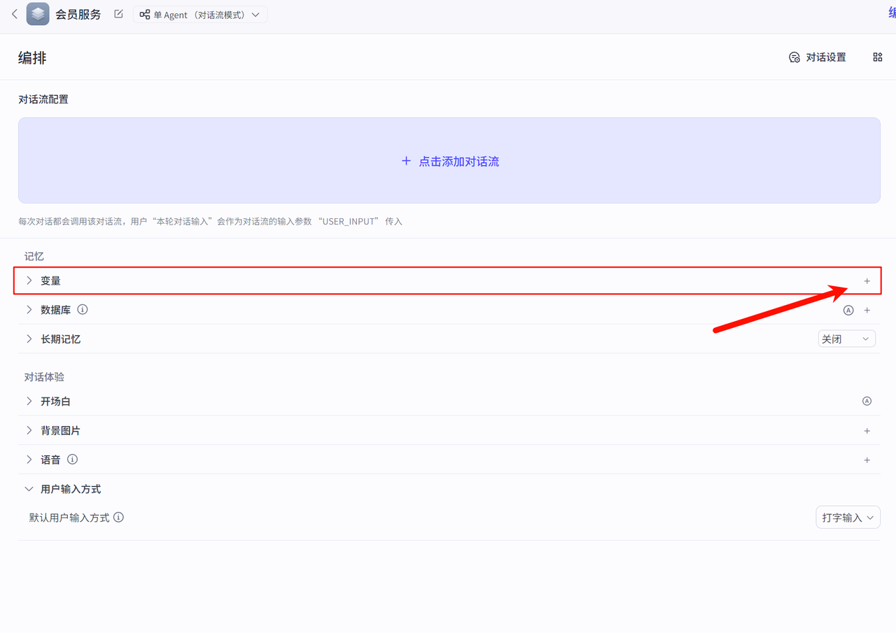 这次我们新创建一个“会员服务”智能体,仍然将其配置为对话流模式。
