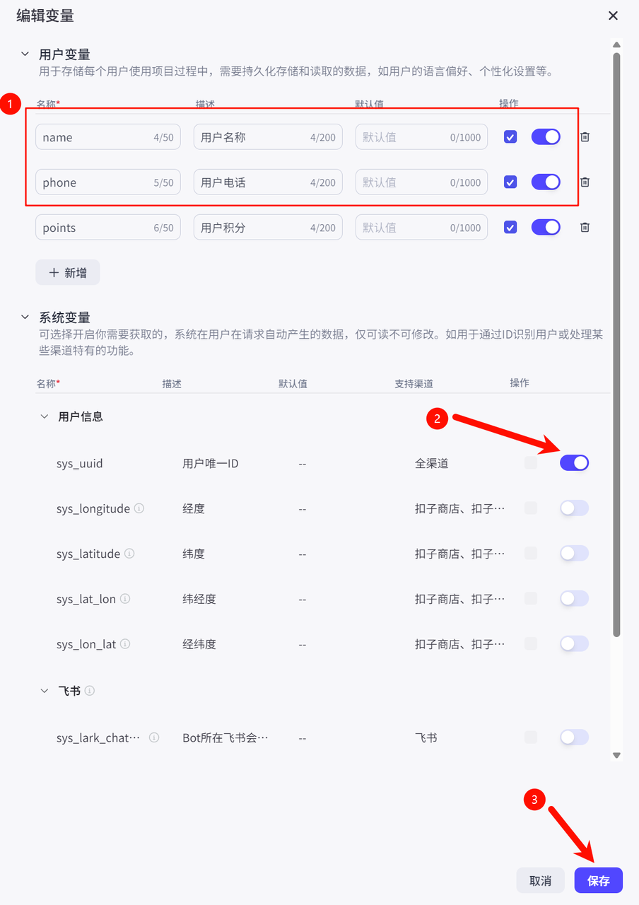 可以看到我们的智能体编排菜单栏中出现了刚刚创建的几个变量