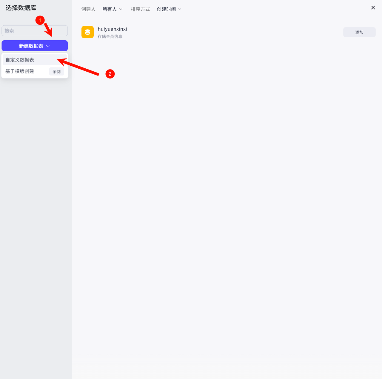 数据表添加我们创建的“huiyuanxinxi”数据表