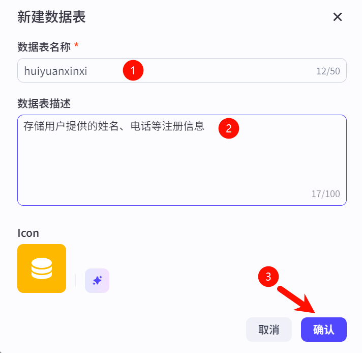 填写数据表信息,名称只能使用字母和数字,填写好了点击“确认”