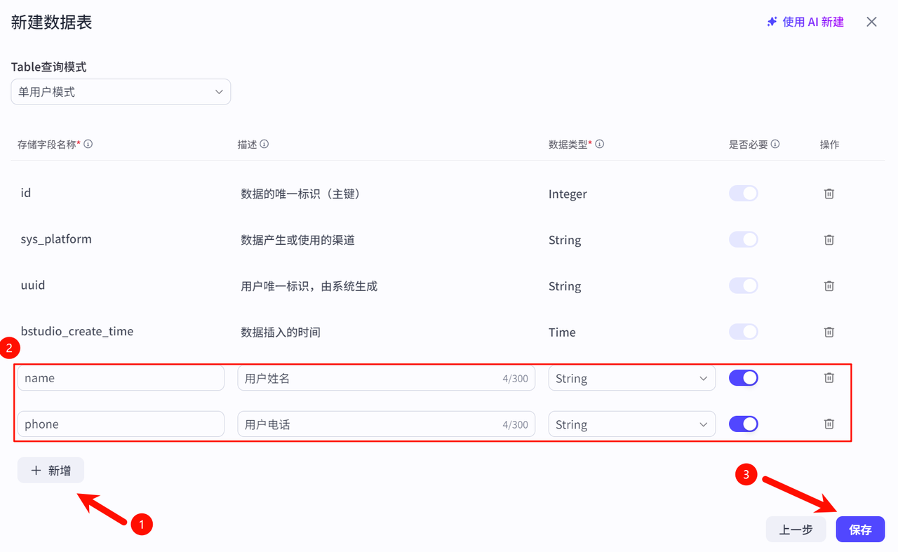 然后一次命名为“name”和“phone”,注意,这里的命名需要与前面创建的变量名一致,数据类型选择“string”,最后的“是否必要”可以根据自己情况点选,选择,即为必要项,即创建数据必填