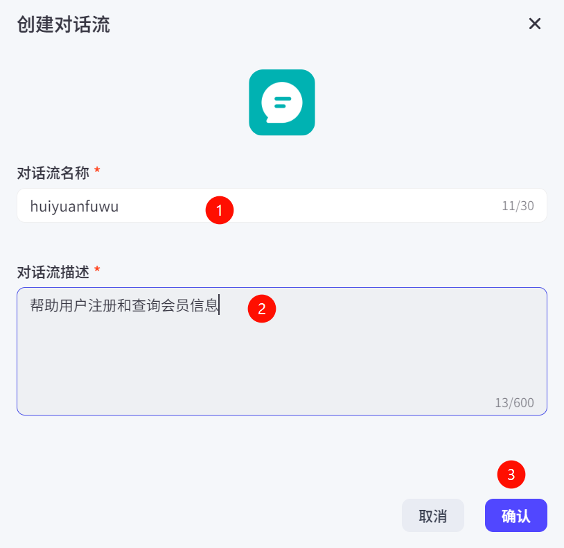 为这个“会员服务”智能体创建一个对话流“huiyuanfuwu”,简单填写描述后确认
