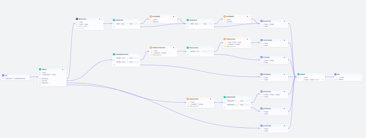以上就是会员服务的对话流用到的所有节点及设置,为了完整展示,再配一个视频说明各节点如何连接及选择输入输出值