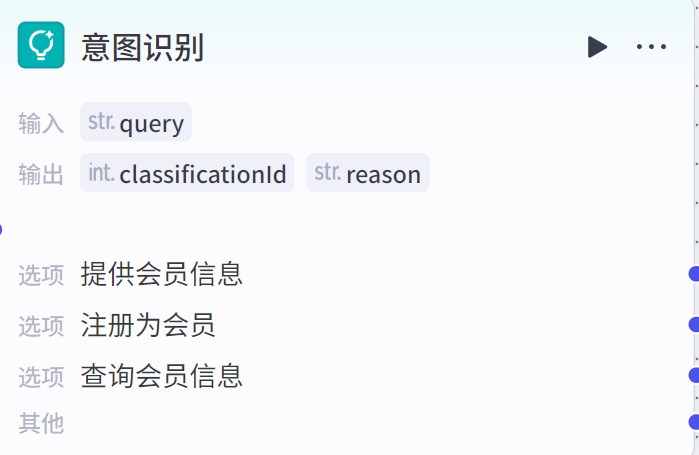 ![]() 意图识别节点将用户输入的内容与相应的工作流做匹配