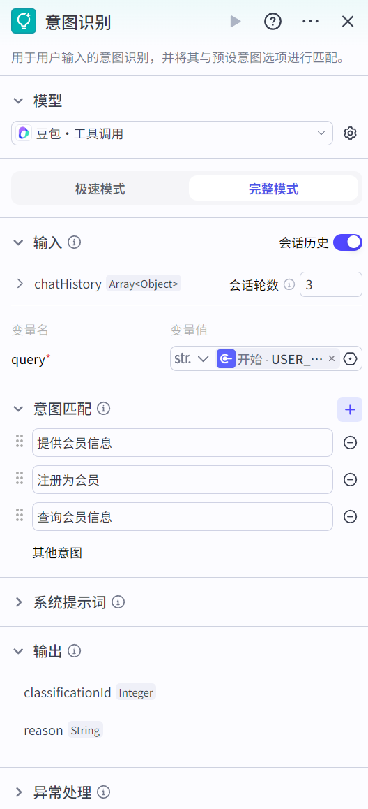 选择“完整模式”,添加三个意图识别项:提供会员信息;注册为会员;查询会员信息 填写系统提示词📄点击此处复制提示词