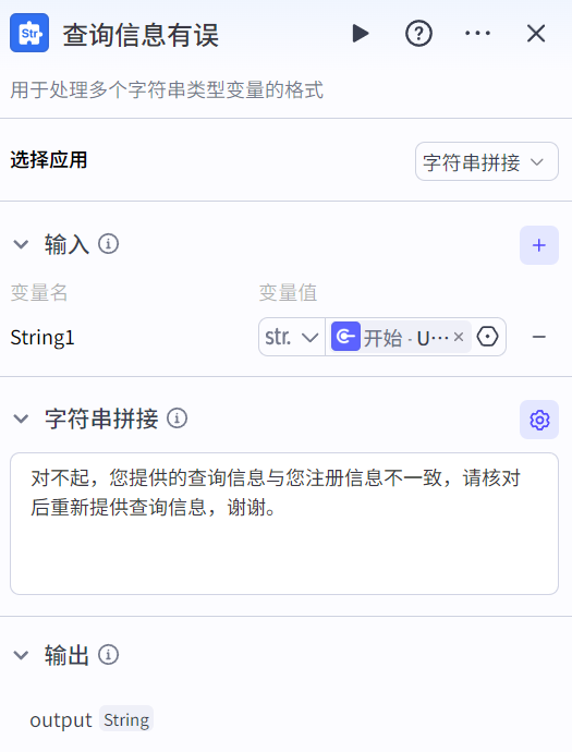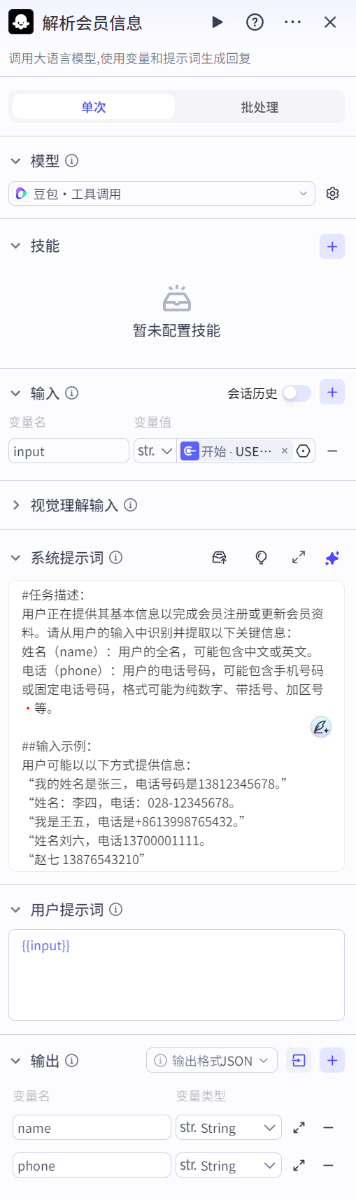 输出就相对复杂一些,因为大模型会帮我们处理用户发来的信息,所以我们直接用大模型处理的结果来输出,输出从用户回的信息中提取的两个变量: