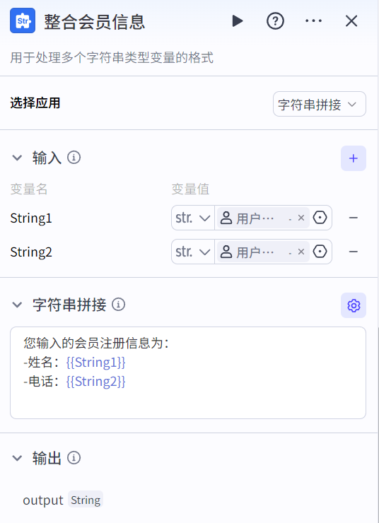 整合查询到的用户的姓名和电话,对应变量名{{String1}}和{{String2}}