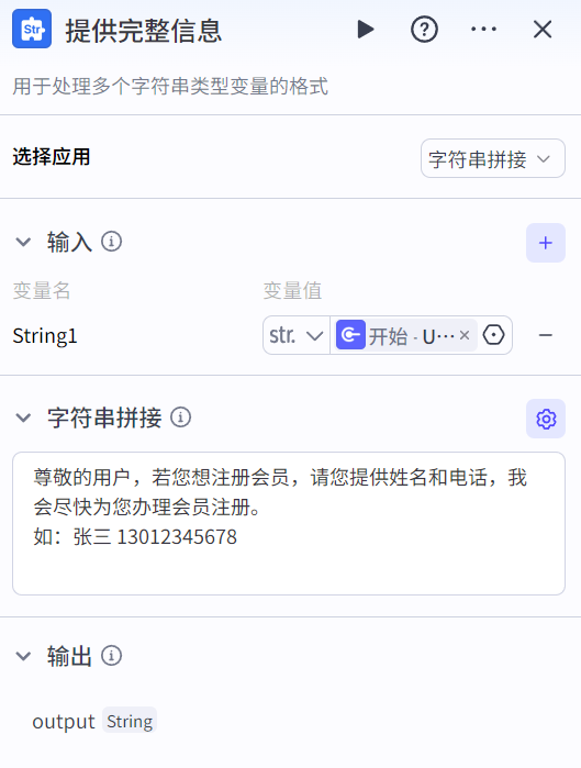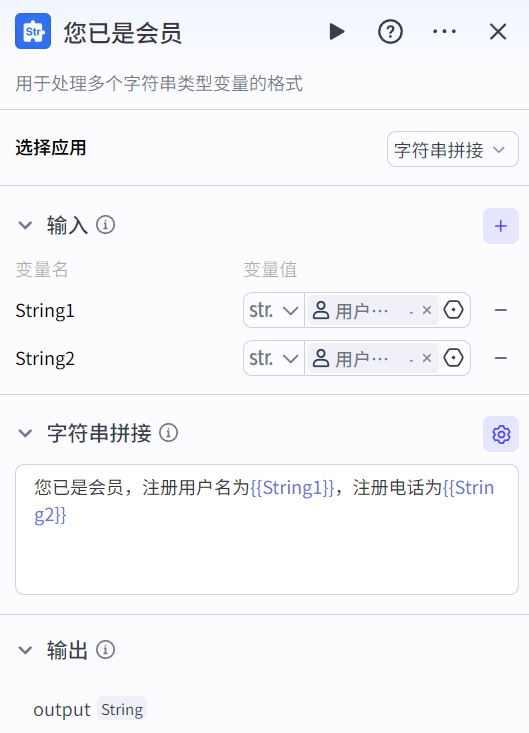 回用户话术参考:您已是会员,注册用户名为{{String1}},注册电话为{{String2}}