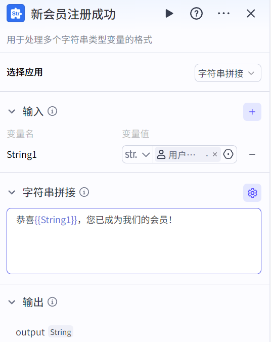回复中插入用户名字:恭喜{{String1}},您已成为我们的会员!