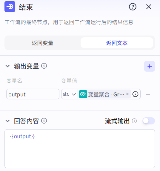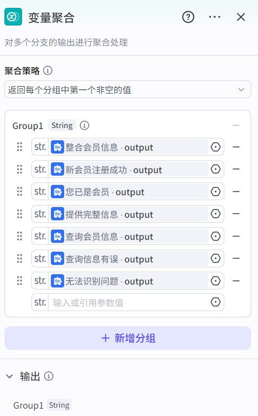 ![]() 这个节点负责把所有分支的文本处理聚合到一起,把第一个非空的值进行输出