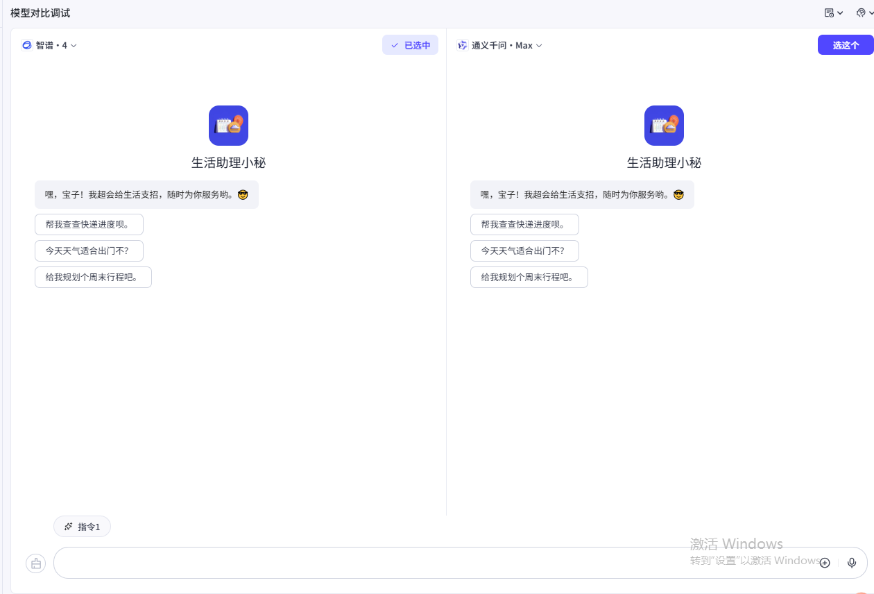 点击之后,就会进入双模型对比调试界面,能够让我们非常直观的感受到两个模型的对话适配程度: