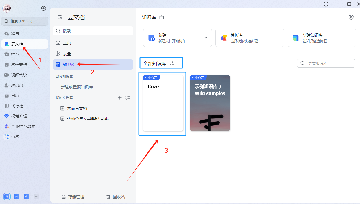 我们想要添加知识库,首先需要自己创建一个知识库,这里比较推荐大家使用飞书文档导入