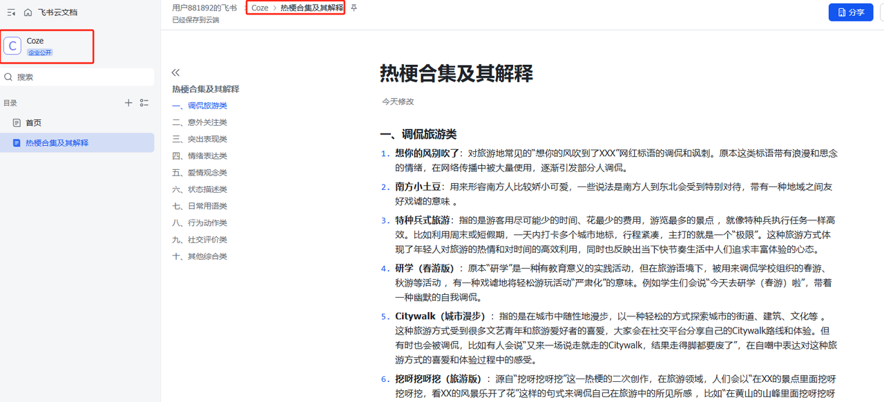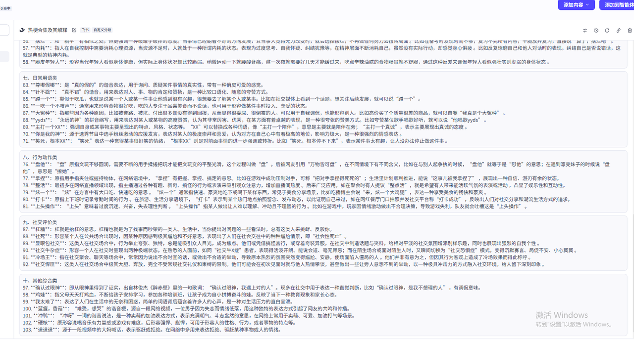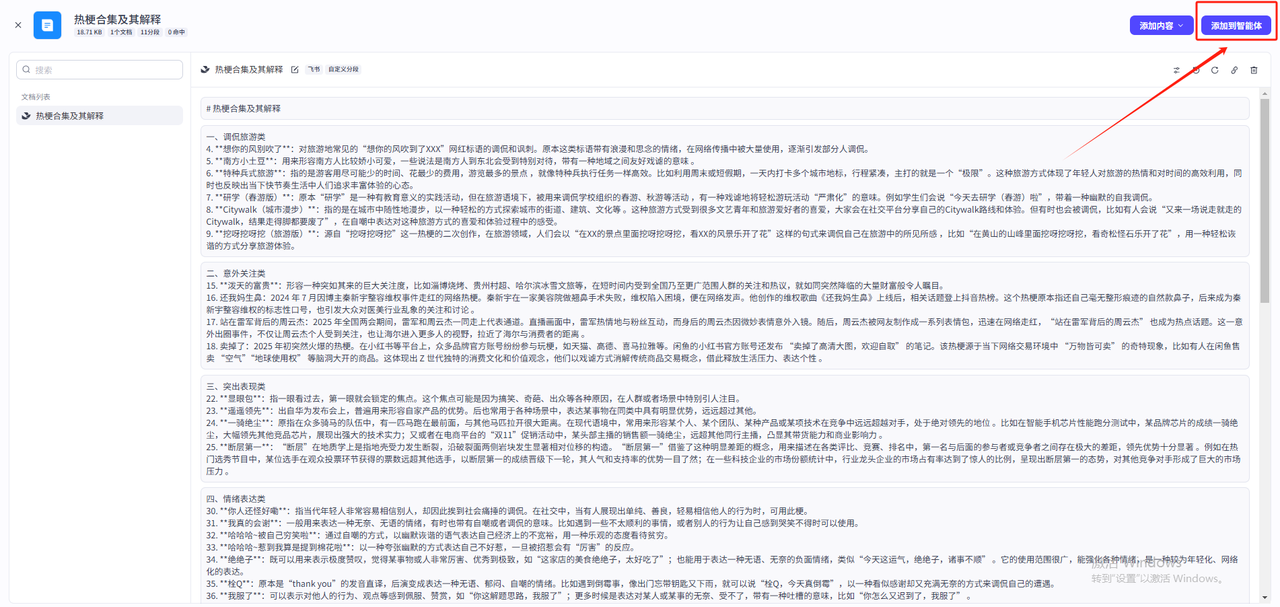 这是我们编写的一个热梗合集及其解释的知识库,做好之后我们在智能体的功能配置区域选择添加进去