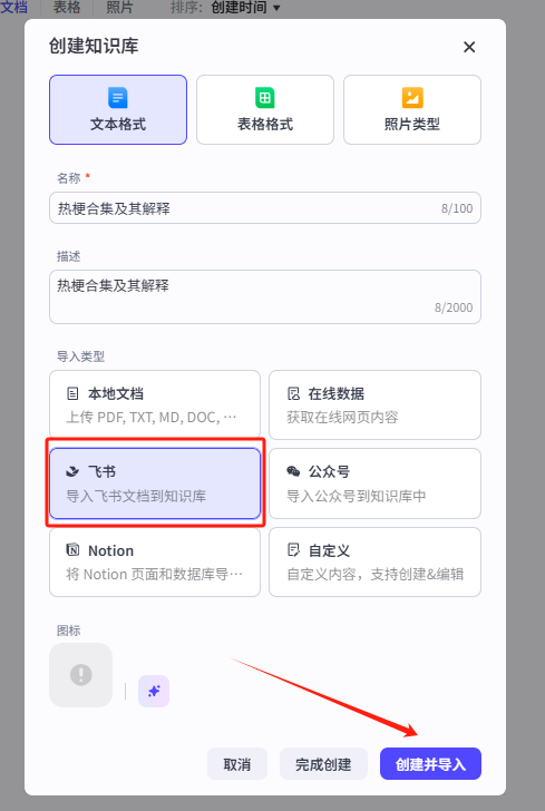 输入名称和描述之后,选择导入类型为飞书,然后选择创建并导入