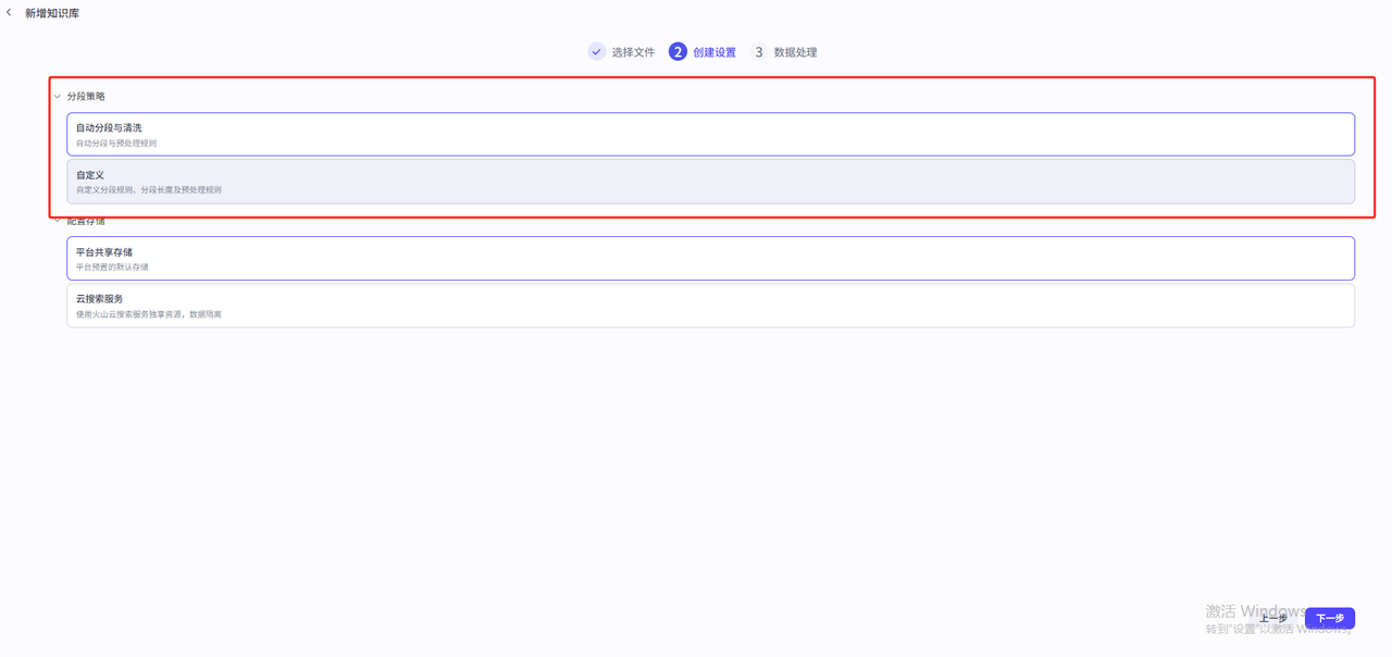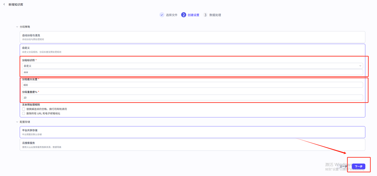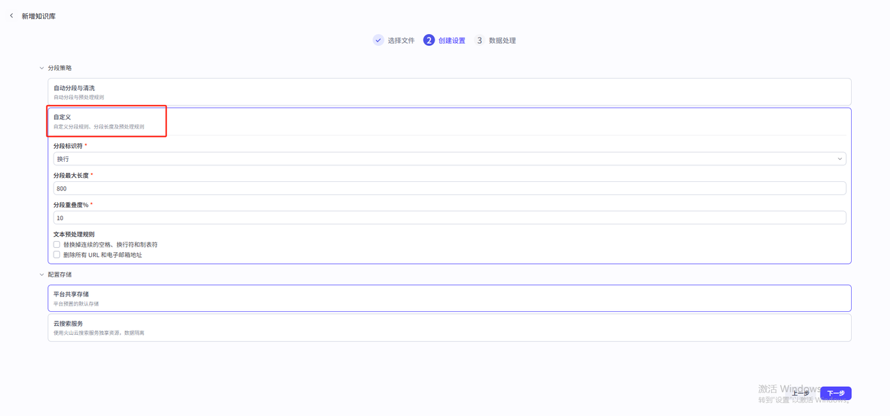 在新增知识库的创建设置这里,我们选择自定义分段规则